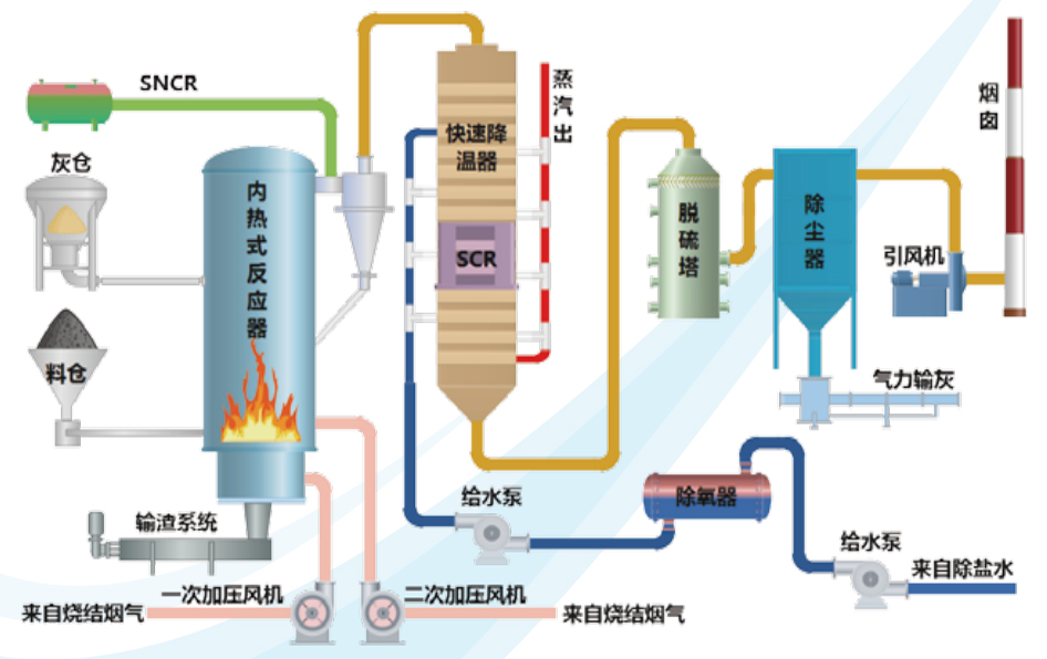 煙氣流程:固廢燃料經(jīng)給料機(jī)送入內(nèi)熱式反應(yīng)器下部與150°C左右的燒結(jié)煙氣進(jìn)行燃燒反應(yīng),另一路經(jīng)過(guò)尾部預(yù)熱后的燒結(jié)煙氣,進(jìn)入內(nèi)熱式反應(yīng)器中下部,進(jìn)行煙氣混合燃燒。出內(nèi)熱式反應(yīng)器的高溫?zé)煔饨?jīng)旋風(fēng)除塵器進(jìn)行煙塵分離,分離后的高溫?zé)煔饨?jīng)進(jìn)入快速降溫器,依次通過(guò)脫硫前靜電除塵器半干法CFB脫硫,布袋除塵器,含有亞硫酸鈣的脫硫灰回送到前端內(nèi)熱式反應(yīng)器進(jìn)行無(wú)害化反應(yīng),經(jīng)弓|風(fēng)機(jī)送至煙囪排放。