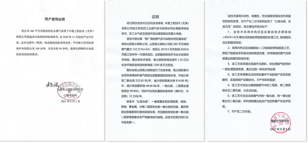 山西高義鋼鐵公司的360m燒結(jié)煙氣量為132萬(wàn)Nm3/h,項(xiàng)目從2019年9月開(kāi)始到2020年6月施工完畢并一次調(diào)試成功,達(dá)到超低排放并為業(yè)主創(chuàng)造經(jīng)濟(jì)效益。通過(guò)該技術(shù)使用,高義鋼鐵獲得運(yùn)城市生態(tài)環(huán)境獎(jiǎng)金獎(jiǎng)勵(lì)和新絳縣技術(shù)創(chuàng)新獎(jiǎng)勵(lì)。